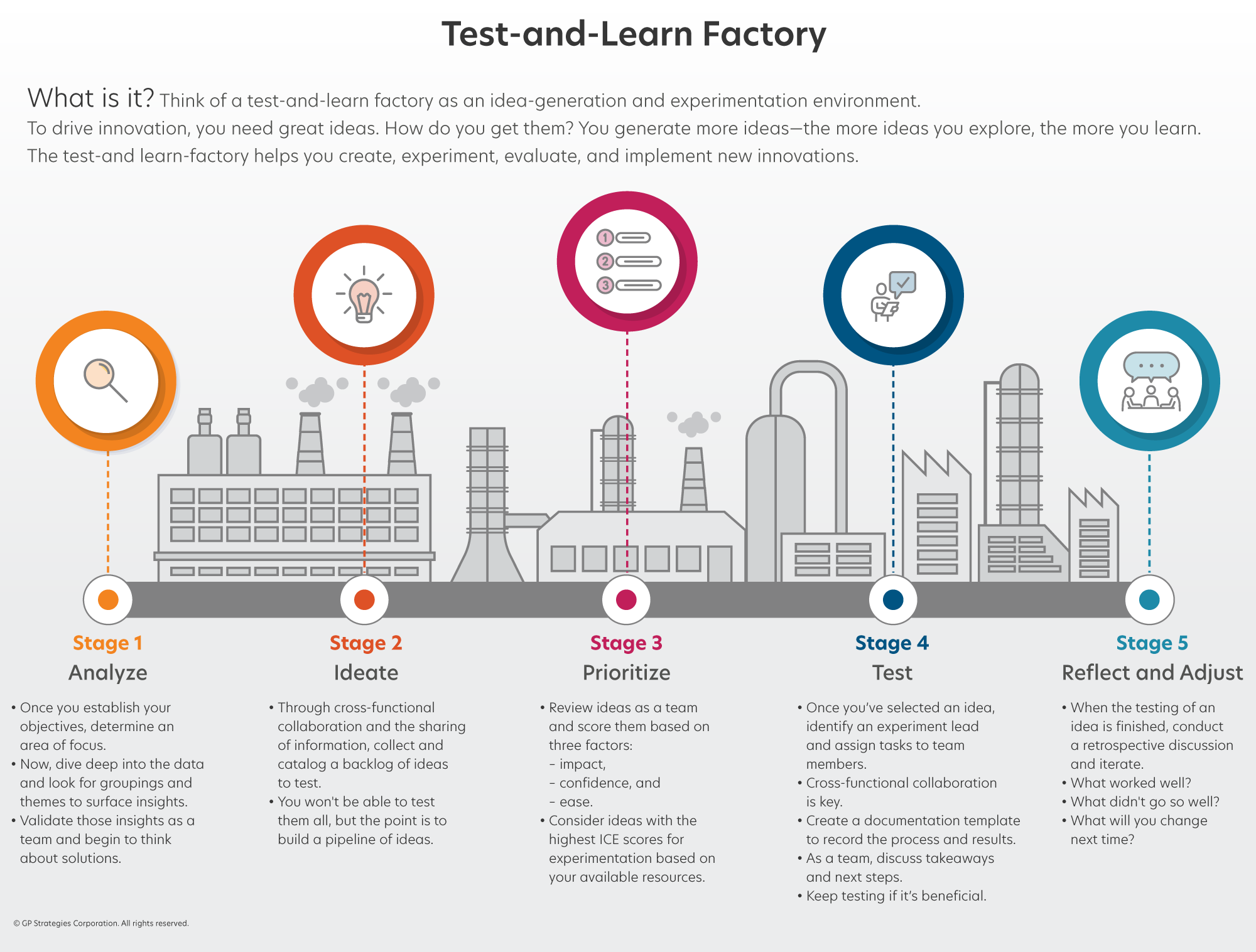 What is it? Think of a test-and-learn factory as an idea-generation and experimentation environment. To drive innovation, you need great ideas. How do you get them? You generate more ideas-the more ideas you explore, the more you learn. The test-and learn-factory helps you create, experiment, evaluate, and implement new innovations.